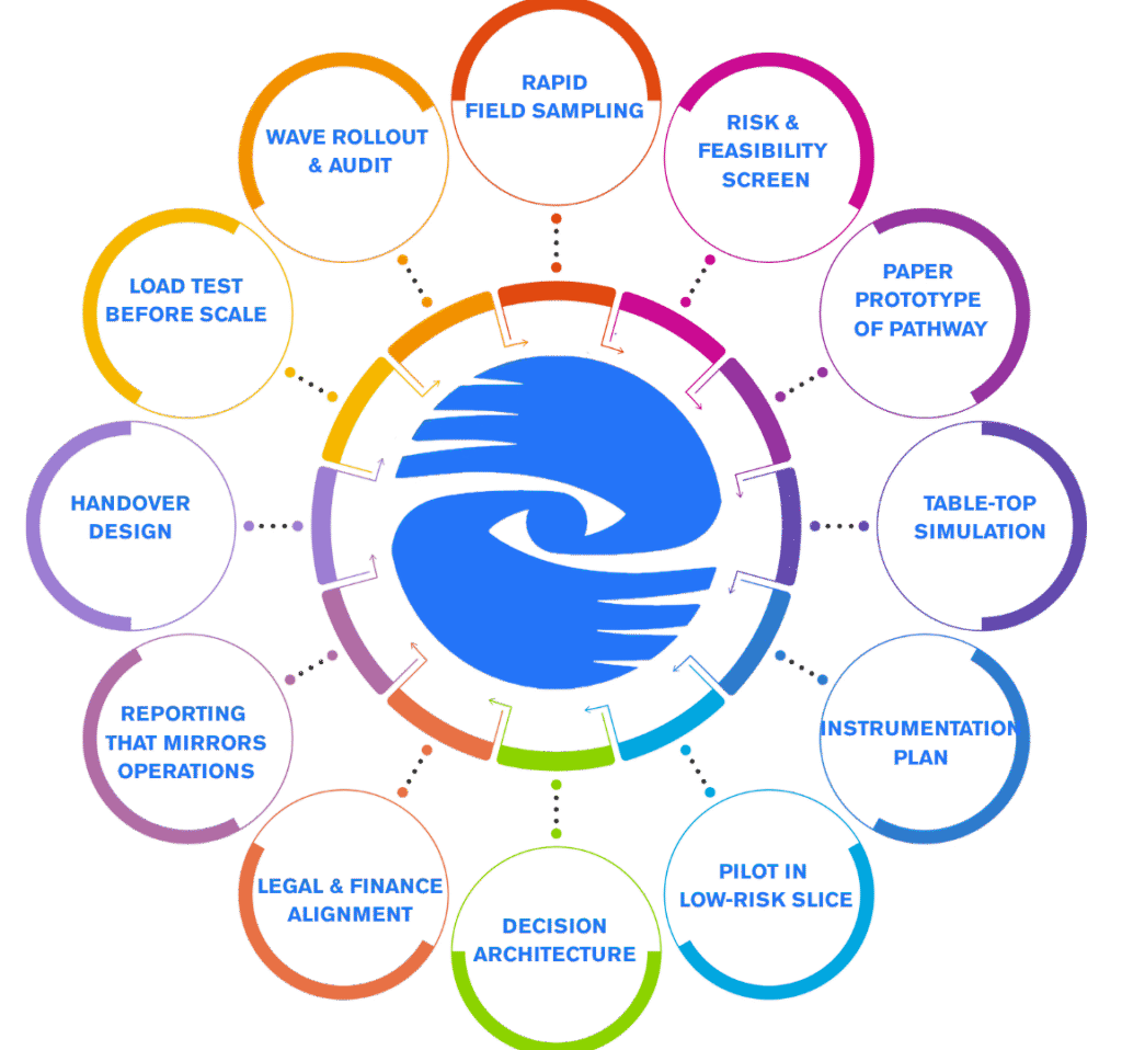 The human-centred method proceeds in staged work. Early observation, feasibility screening, and table-top trials come before any end-to-end pathway. The objective is to convert design-led business systems into a tested pathway with defined roles, timings, controls, and measures that sustain performance during peak load. Early testing exposes structural misalignment in business before it sets into policy and directs governance, legal, and financial design to the points of highest operational risk. Each stage records evidence through instrumentation so leaders can see whether human-centred systems design is stabilising behaviour: decision routes followed, reports delivered on schedule, handovers completed, and exceptions raised through the authorised channel. The sequence that follows covers rapid field sampling, paper prototypes, simulation, a contained pilot, and load tests prior to any scale.